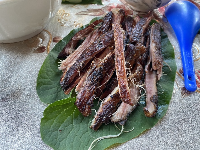 Sau đó chúng mình được một nhà dân chia sẻ lại cho ít thịt lợn rừng gác bếp. Sợi thịt rất mềm và thơm nhé.