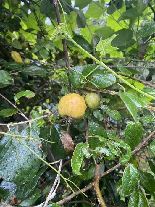 Với địa điểm thứ 2 mình nhắc đến ở đây cũng theo cách tương tự. Chúng mình có hứng thú được nhìn một cây táo mèo có quả. Chúng mình được chỉ một con đường đi vào bản. Leo lên những con dốc cao, hỏi tiếp một vài người với câu hỏi chung là ở đâu có cây táo mèo có quả. Vì chúng mình không dự tính là đi sâu vào bản tới vậy, lại thường xuyên leo dốc cao 10 độ, nên chỉ một lát vạch xăng cứ liên tục chạm về đỏ. Ngay khi chuẩn bị bỏ cuộc vì hành trình vô định mà xe có thể hết xăng bất cứ lúc nào và trời bất chợt đổ mưa, chúng mình đến một ngã 3, một dãy tạp hóa của người dân địa phương. Tại đây chúng mình được anh chủ quán dẫn lên nhà anh với một vườn táo mèo có quả. Mình cũng chụp hú họa được tấm ảnh để lưu làm kỉ niệm. Quả thực là nó cũng không có gì đẹp cả, mình cũng biết điều đó từ trước. Nhưng hành trình tìm được nó mới là thứ thú vị.